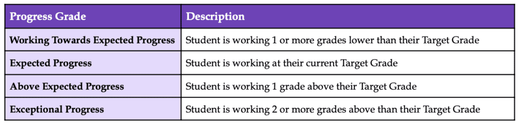The Progress Indicator (PI) is an assessment of how students are performing at each reporting cycle in relation to their Target Grade (TG). Table 1.2 provides a summary of the progress grading system.